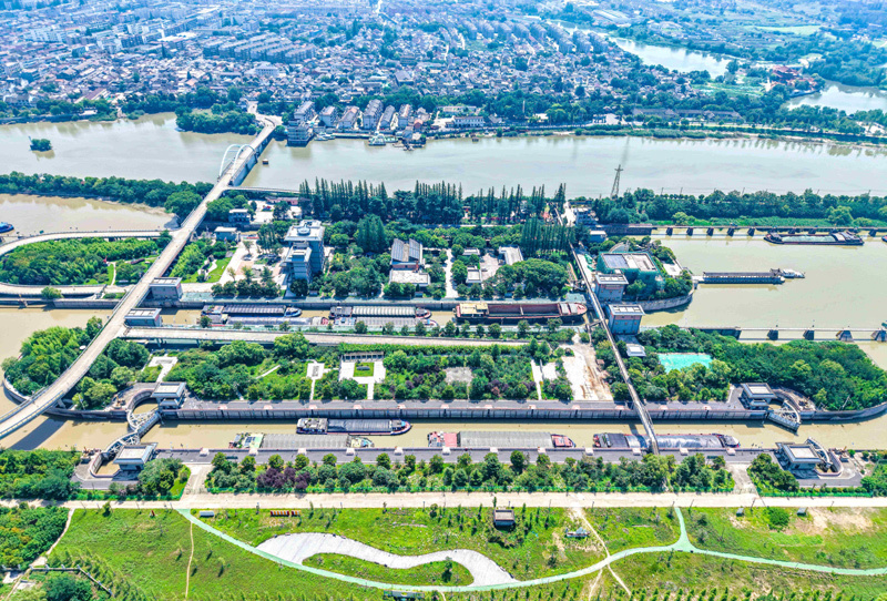 2025年7月4日,船舶有序通過京杭大運河揚州段邵伯船閘(無人機照片)。新華社發(fā)(任飛 攝)