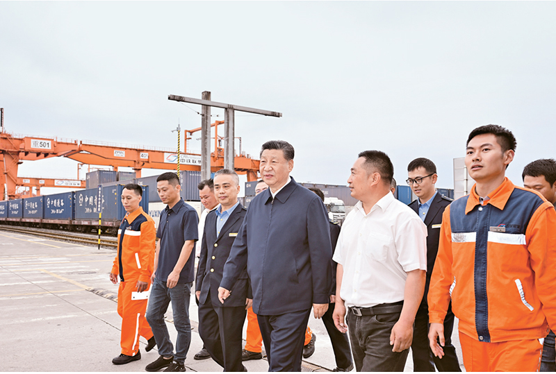 2024年4月22日至24日,中共中央總書(shū)記、國(guó)家主席、中央軍委主席習(xí)近平在重慶考察。這是22日下午,習(xí)近平在重慶國(guó)際物流樞紐園區(qū)重慶鐵路集裝箱中心站,同貨車(chē)司機(jī)、列車(chē)司機(jī)、裝卸工人、場(chǎng)站管理人員等親切交流。 新華社記者 岳月偉/攝