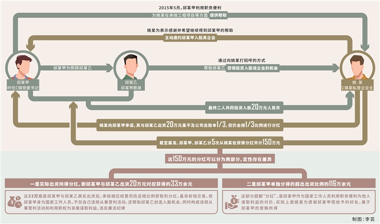 違反廉潔紀(jì)律。2015年5月,時(shí)任C鎮(zhèn)黨委書記的邱某甲為C鎮(zhèn)某私營企業(yè)主姚某在承接工程項(xiàng)目等方面提供幫助,姚某為表示感謝并希望繼續(xù)得到邱某甲的幫助,主動邀約邱某甲入股其實(shí)際控制的某私營企業(yè)。為照顧胞弟邱某乙,邱某甲通過向姚某打招呼的方式,幫助邱某乙也獲得投資入股該企業(yè)的機(jī)會,最終二人共同投資入股20萬元人民幣(幣種下同),邱某甲僅出資但未實(shí)際參與經(jīng)營。2018年至2022年,二人從上述企業(yè)按出資比例分紅共33萬余元。