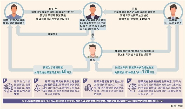 其中,2017年,鄢某在擔(dān)任C縣縣委常委、縣政府副縣長(zhǎng)期間,接受商人薛某的請(qǐng)托,向C縣某自來(lái)水公司(系鄢某分管的C縣住房和城鄉(xiāng)建設(shè)局下屬的國(guó)有企業(yè))負(fù)責(zé)人肖某“打招呼”,要求肖某幫助薛某承攬?jiān)摴灸匙詠?lái)水管道建設(shè)項(xiàng)目,肖某應(yīng)允。同期,另一私企負(fù)責(zé)人楊某某向肖某表達(dá)承攬?jiān)擁?xiàng)目的意愿,請(qǐng)托肖某勸薛某放棄投標(biāo)并給予其“補(bǔ)償金”120萬(wàn)元。經(jīng)肖某撮合,薛某同意收取“補(bǔ)償金”并放棄投標(biāo)。薛某和肖某沒將此事告訴鄢某。最終,在肖某的幫助下,楊某某公司順利中標(biāo)該項(xiàng)目。隨后三年間,楊某某分多次通過(guò)肖某向薛某支付“補(bǔ)償金”共計(jì)120萬(wàn)元。薛某為了感謝鄢某,分兩次送給鄢某現(xiàn)金共計(jì)40萬(wàn)元。