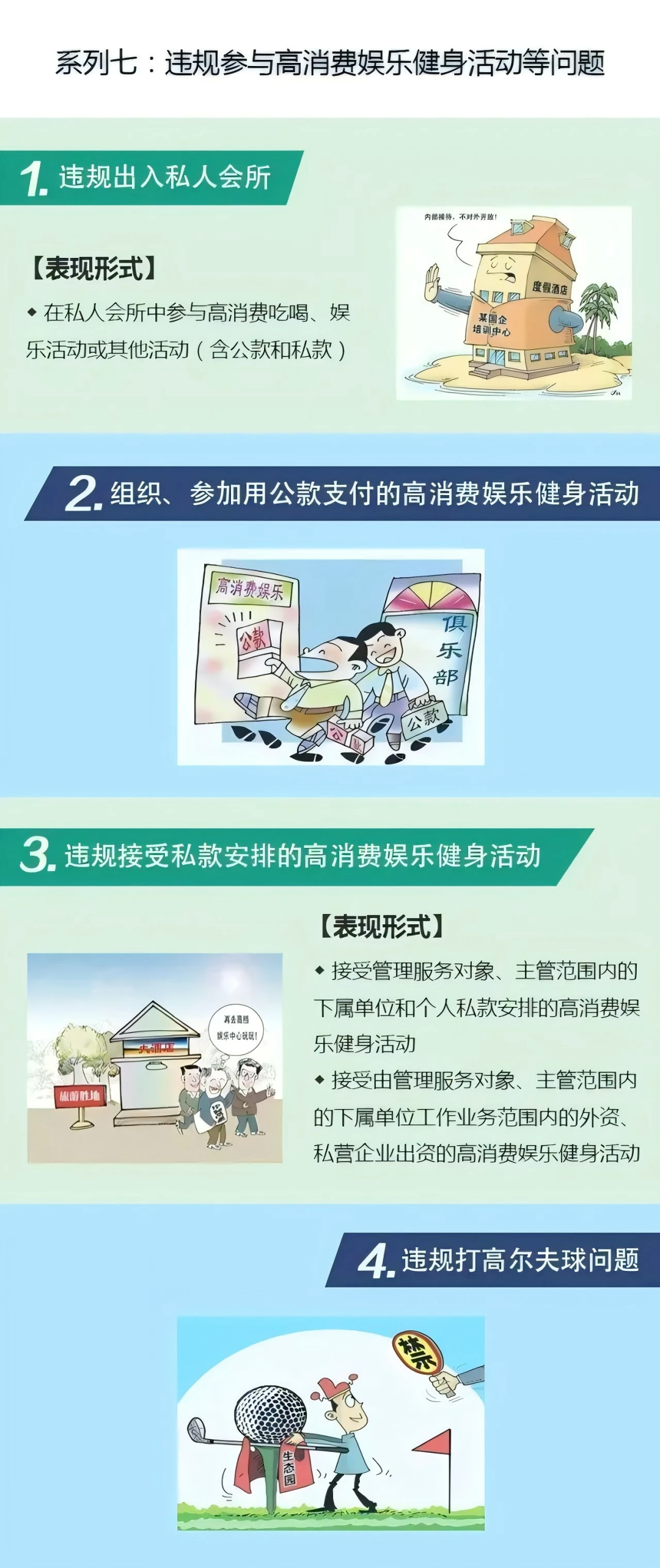 6.其他(包括6種表現(xiàn):違規(guī)配備和使用公車、樓堂館所問題、提供或接受超標(biāo)準(zhǔn)接待、組織或參加用公款支付的高消費(fèi)娛樂健身等活動(dòng)、接受或提供可能影響公正執(zhí)行公務(wù)的健身娛樂等活動(dòng)、違規(guī)出入私人會(huì)所、領(lǐng)導(dǎo)干部住房違規(guī))。