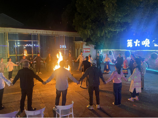 夜幕降臨,大家搬好桌椅、發(fā)放物料,在訓(xùn)練場地中央點(diǎn)燃慶祝的篝火。涼風(fēng)拂過場地,音響師調(diào)出美妙的音符,大家也按捺不住舞動(dòng)的腳步。